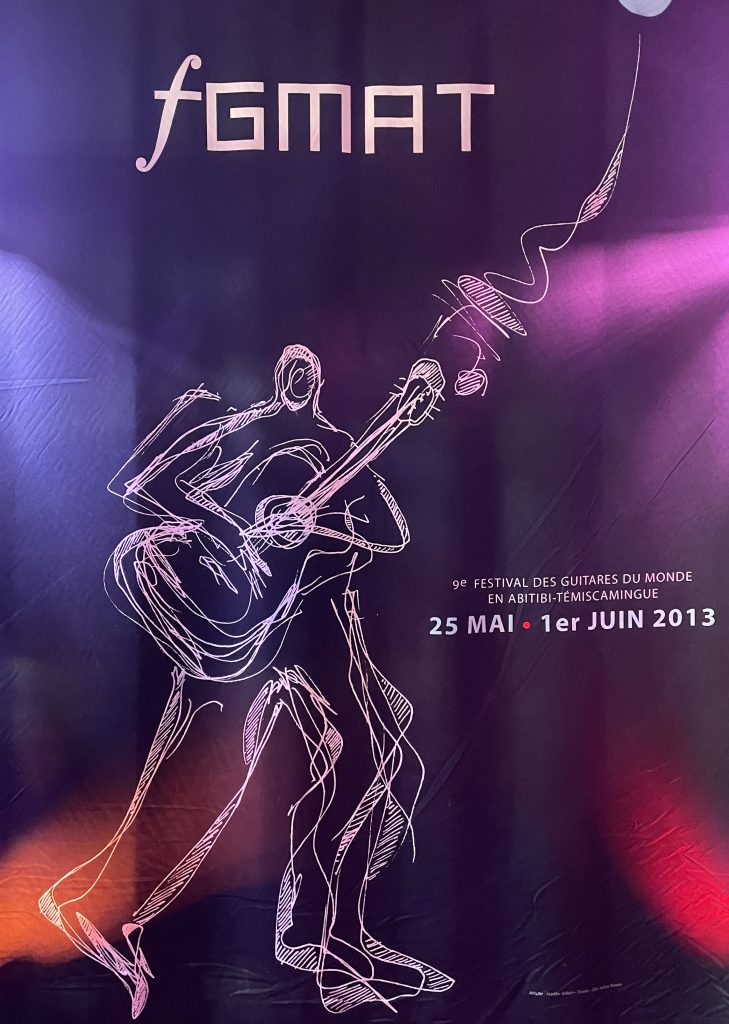 En mai 2025, je participais au Salon du Livre d’Abitibi-Témiscamingue à Amos. Comme je n’avais pas mis les pieds dans la région depuis les années 1970 quand je jouais dans le groupe de Jocelyn Bérubé, j’ai décidé d’aller aussi à Rouyn-Noranda au Festival des guitares du monde. Mon séjour m’a rappelé à quel point les gens y sont sympathiques, notamment celles et ceux qui se dévouent pour que leur festival fasse honneur à la guitare et à la musique de partout. Respectueux des droits des artistes, je n’ai pas capté de prestations, mais j’affiche ici quelques images des lieux visités.